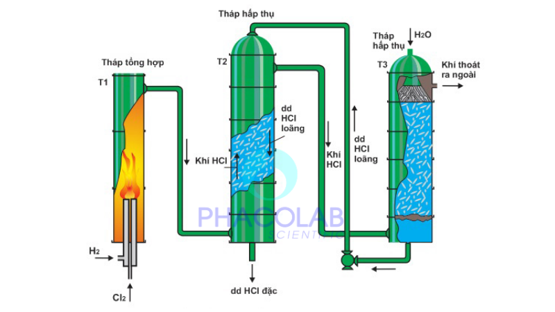 Điều chế HCl trong công nghiệp từ khí clo (Cl2) và khí hydro (H2)